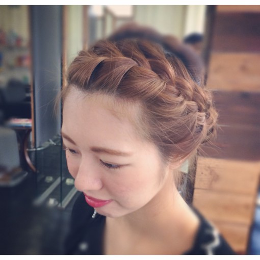 前髪もスッキリとあげて、全体を編み込みとクルクルねじってまとめたスタイル